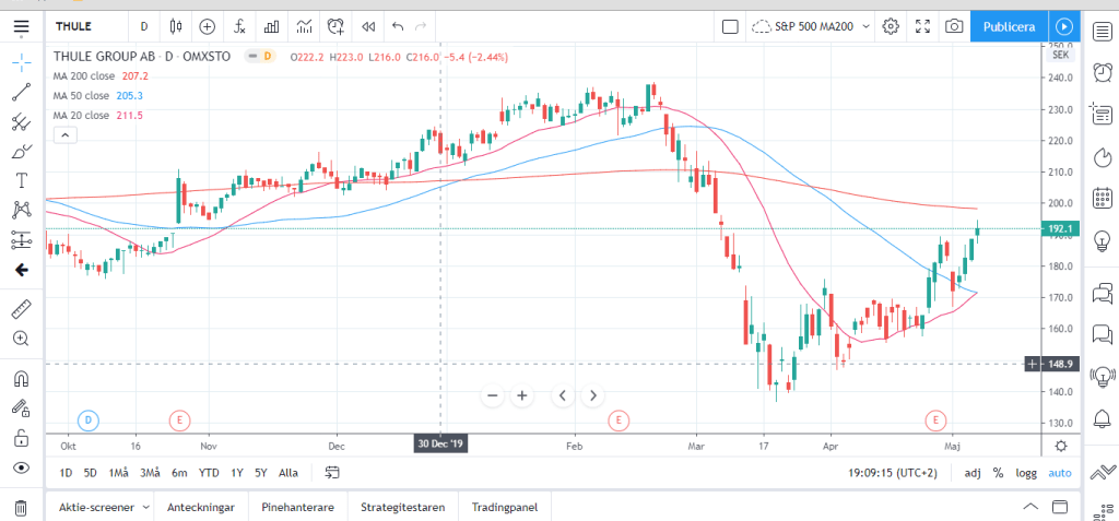 Har gjort backtesting på Thule Group då MA20 korsar MA50 nedifrån.