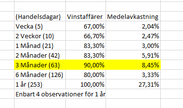 Här nedan ser vi backtesting på Thule för att veta ifall vi har en edge eller ej. Det som ser mest intressant ut är 3 månader (63 handelsdagar) då vi har 90 % vinstaffärer samt en årsavkastning på börsen som medelavkastning. Att hålla positionen i 1 år ser ännu mer lockande ut dock är det enbart fyra observationer som datan bygger på så det är alldeles för lite data för att ta ett beslut på.