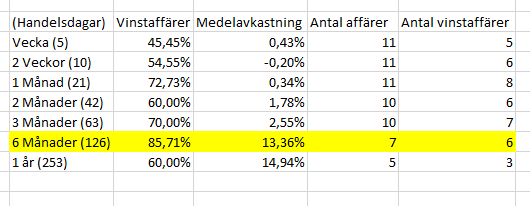Backtestingen visar att vi har mycket hög sannolikhet för uppgång (hela 86%) ifall vi håller vår position i 126 handelsdagar. Medelavkastningen är även hög, hela 14%.