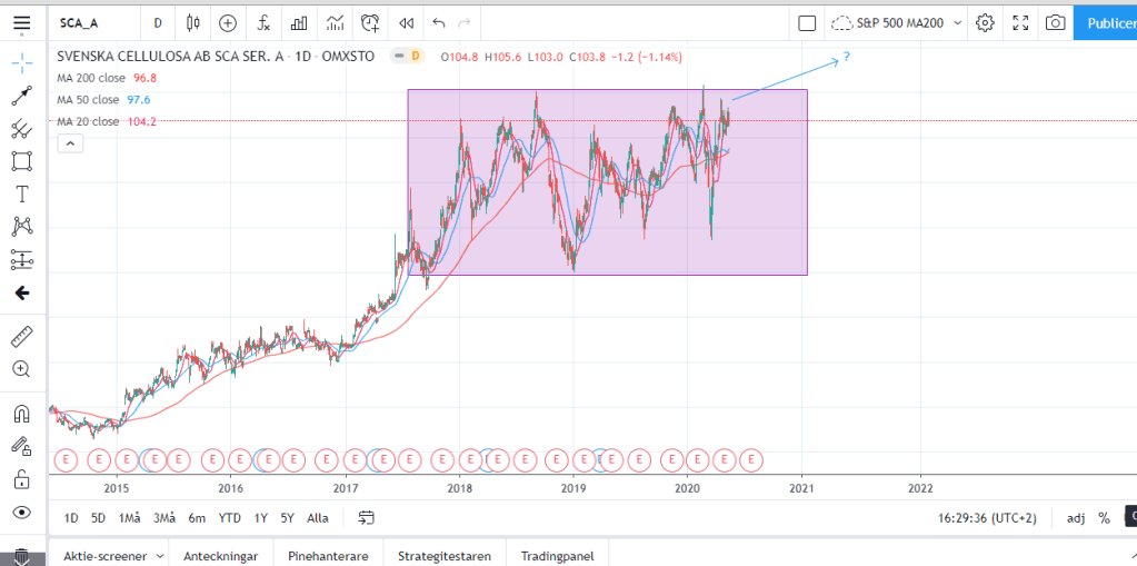 SCA handlas inom ett stort intervall och MA50 har korsat MA100 vilket talar för uppgång på längre sikt enligt historisk data.