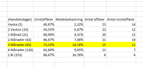 Vi ser att på 63 handelsdagar har vi 73% vinstaffärer samt 14% i avkastning.