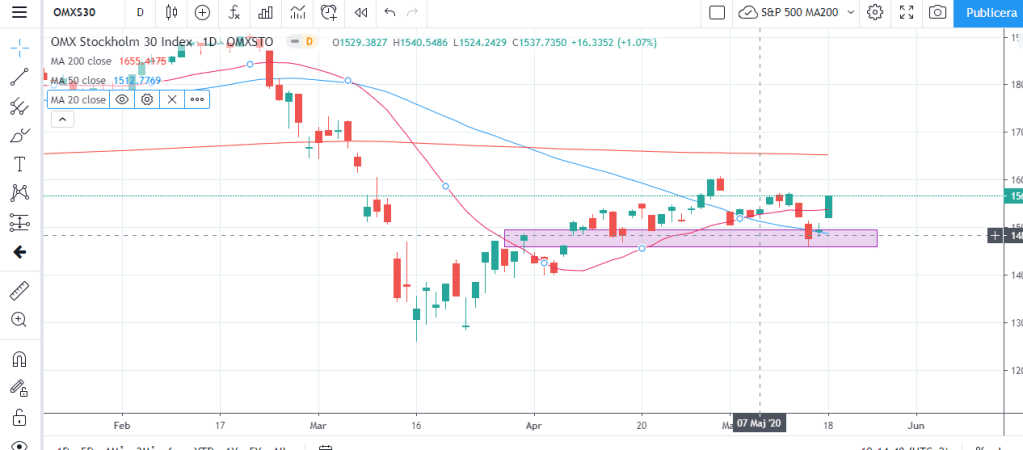 Idag stängde vi ovanför MA20 och dagens uppgång skapade en kraftig grön candlestick.
