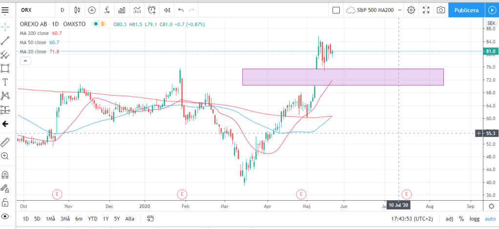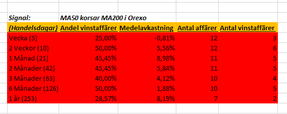 MA50 har korsat MA200 i Orexo. Det brukar vara en bra signal för framtida uppgång när ett kort medelvärde korsar ett längre. I Orexo är det dock inte ett recept för fortsatt uppgång ifall man kollar på det statistiskt. Vi kan även se nedan att vi har ett gap som förmodligen kommer fyllas.