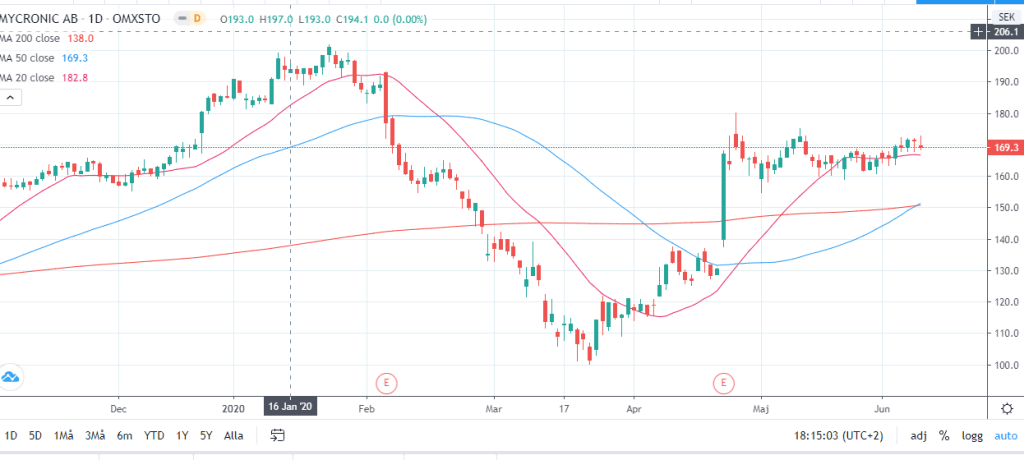 Idag stängde MA50 ovanför MA200 i Mycronic på en annars svag börs vilket får ses som ett styrketecken. Därför gjorde jag lite backtesting för att se ifall vi har en edge för framtida uppgång.