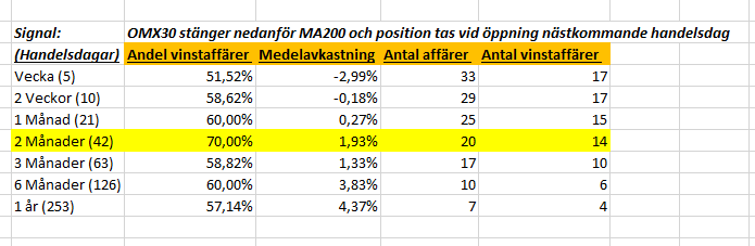 Igår stängde OMX30 nedanför MA200 vilket ses som att vi återigen befinner oss i en negativ marknadsfas. Ifall jag tar mig friheten att göra lite vilda gissningar innan jag kollar på faktiskt data så skulle jag inte bli förvånad ifall den branta V-uppgången endast är en uppgång i en nedåtgående trendkanal. Det som gör mig negativ är att vi stängde nedanför MA200 samt så kan vi rita upp en trendkanal med negativ lutning. Det som skulle ändra min syn är ifall vi bryter upp ovanför MA200 samt tar oss ur den negativa trendkanalen. Men men nog med gissningar och låt oss kolla på backtestingen.