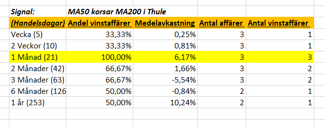 Vi kan se ovan att vi har väldigt få datapunkter (antal affärer) så går inte att göra någon bra analys, dock så har vi 100 % vinstaffärer ifall man tar en position på en månads sikt. Så i ett sådant här fall hade jag inte gått in med mina vanliga 10 % utan hade tagit en mycket mindre position då jag inte anser att jag har tillräckligt med data att stödja mig på.