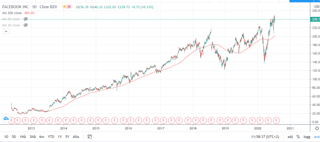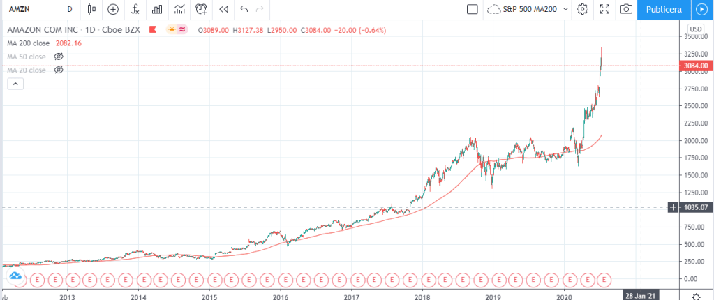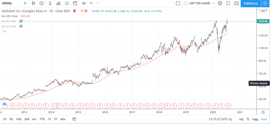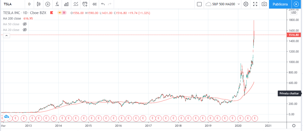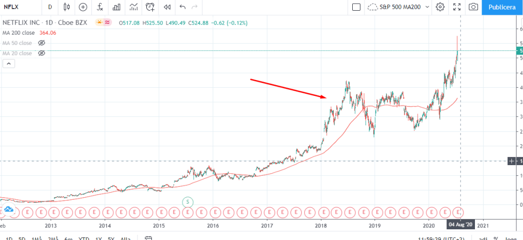 Vi kan se ovan att i alla aktier så brukar kursen pendla omkring MA200 men i dagsläget är vi väldigt långt ifrån vilket jag anser bara kan betyda att vi skall ned i dessa aktier. Vi kan se att i exempelvis NETFLIX så avvek kursen från MA200 i mitten av 2018 vilket ledde till en nedgång och så brukar fallet vara. Tesla är ett case för sig då aktiekursen avviker orimligt mycket från MA200 vilket bara kan leda till en pullback. Det ända som kan motverkar att aktiekurserna skall ned är att MA200 stiger brant uppåt i alla casen men just nu är fallhöjden hög. En annan intressant sak är att ifall FANG-bolagen tar en paus i uppgången så måste vi få en sektorrotation till bank eller verkstad för att börsuppgången skall fortsätta. Vi såg det tidigare i våras att när tech-bolagen gick dåligt så gick verkstad/bank/laggande sektorer bättre.