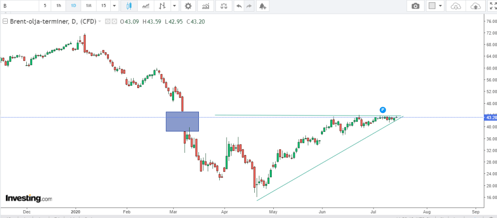 Vi kan se ovan att vi befinner oss i en stigande triangel vilket brukar leda till ett uppbrott på ovansidan (vet tyvärr inte sannolikheten i det här fallet) och volatilitenten har minskat på sistone. Vi har även ett gap som inte stängts helt ännu så min gissning är att vi kommer göra ett brott ur triangeln för att i förstahand stänga gapet.