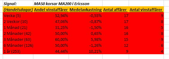 I fredags så stängde MA50 ovanför MA200 i Investor och då passade jag på att göra lite backtesting som vanligt. Investor är lite extra intressant då de har stora innehav i både Ericsson samt Astra Zeneca (alltid lika svårstavat) och jag tror själv på Ericsson då de är aktiva inom 5G.
