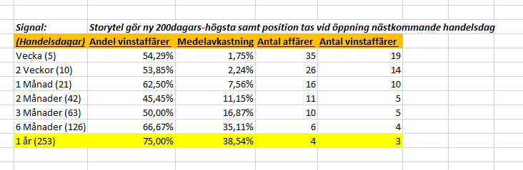 Vi kan se att vi har en edge på långsikt dock skall vi vara observanta på att det är få datapunkter vi dragit den slutsatsen på. Här kan vi använda grafen och backtestingen för att göra en slutgiltig bedömning/gissning och det är att Storytel samlar styrka de kommande månaderna (går ned mot MA200) för att sedan fortsätta uppåt.