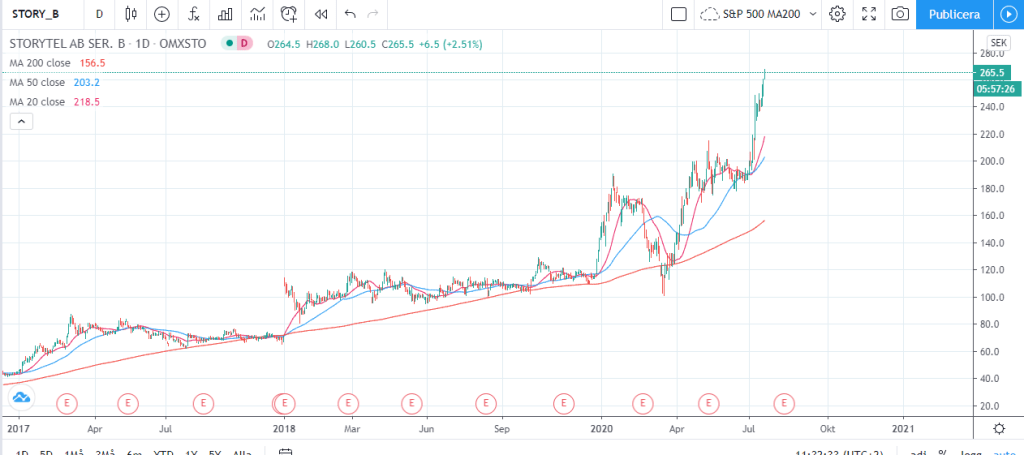 Storytel är ett bolag som jag har i portföljen och idag ser aktien ut att stänga på en ny 200dagars-högsta.