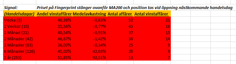 Priset på fingerprint är inte långt ifrån MA200 så därför kan vi göra lite backtesting för att vara förberedda när signalen väl visar sig, dock ser vi att vi inte har någon edge när aktien väl stänger ovanför MA200.