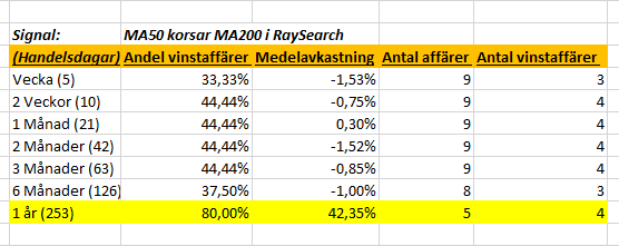 Vi kan se att vi har en edge på längre sikt dock få affärer samt så var det problem med att få fram data att göra analysen på (finns data från 2000 men den är oanvändbar då många dagskurser har en nolla i protokollet så därför har jag tagit data från 2008).