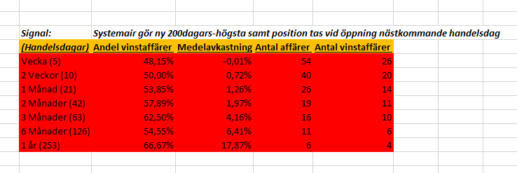 Jag skrev en analys angående Systemair runt den 21 juni då MA50 korsade MA200 och det visade sig att vi hade en edge på lång sikt. Sedan dess har aktien gått från cirka 149 kr till 206 kr. Vilket är en avkastning på cirka 38 % [(206-149)/149]*100. Nu så ser aktien ut att stänga på en ny 200dagars-högsta.