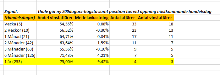 Igår så stängde Thule på en ny 200-dagars högsta. Jag har analyserat Thule i två tidigare analyser där den första visade att vi hade en edge (aktien stod i 192,1 kr då och nu 271,40 kr så den analysen stämde bra) samt en efter som även den visade att vi hade en edge (då stod aktien i 230,60 så även där stämde analysen bra).