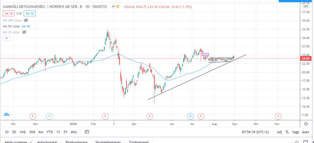 Aktien stängde ovanför MA50 den 28:e augusti för att igår återigen stänga nedanför så det kan vara en bra tanke att bevaka ifall aktien stänger ovanför MA50 igen då vi har en edge vid sådana scenarion.