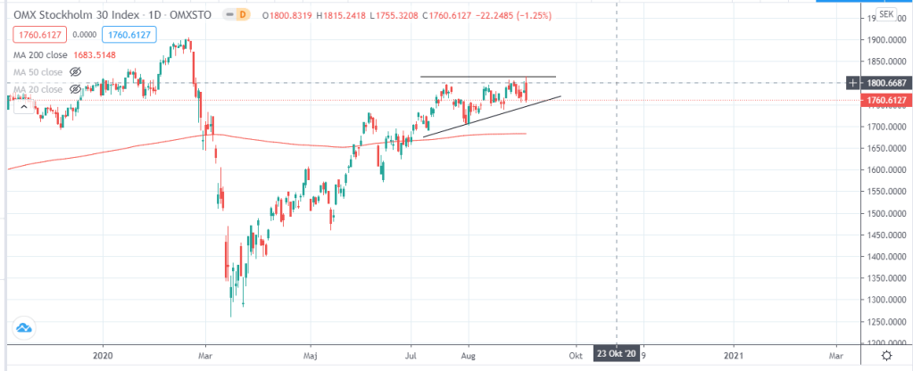 Kollar vi enbart på OMX så ser vi att vi befinner oss i en stigande triangelformation vilket brukar leda till fortsatt uppgång, vi ser även här att vi befinner oss en bit ifrån MA200 dock inte lika ohälsosamt långt ifrån som i många teknikaktier.