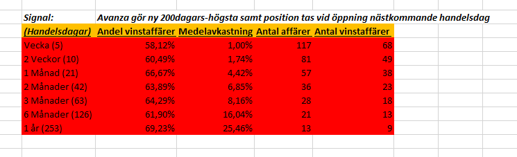 Vi kan se att 200-dagars högsta i Avanza är en signal med högre edge gentemot MA5 korsar MA10, dock inte tillräckligt hög den heller (minst 70%).