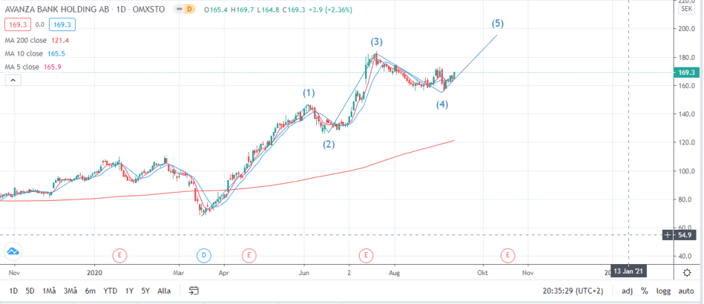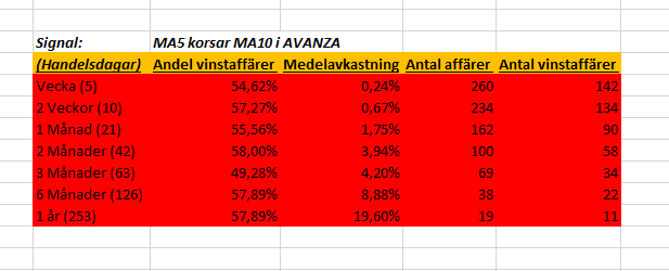 Vi kan se att aktien ser ut att avslutat en fjärde våg enligt Elliots vågteori och det skulle betyda att vi har startat den femte samt avslutande vågen. Vi kan kolla vad som händer när MA5 korsar MA10 som skedde i fredags. Den här veckan tänkte jag kolla enbart på aktier där MA5 korsar MA10 då det borde fånga upp korta tidsperioder som man måste hålla affärerna samt så har jag bara gjort backtesting två gånger tidigare på dessa medelvärden och båda har varit negativa, så tänkte undersöka ifall det är en signal som det är svårt att få en positiv avkastning på.