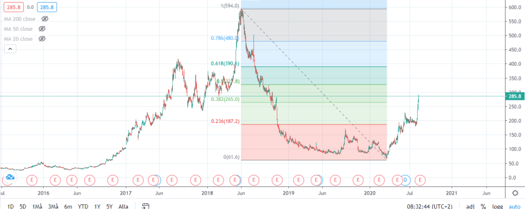 Då stod aktien i 285,8 kr i i dagsläget i 381 kr så vi har en avkastning på cirka 33 %. Skrev i inlägget att fibb-nivå 0,618 var ett av målen (vi handlas nära just 0,618 i dagsläget).