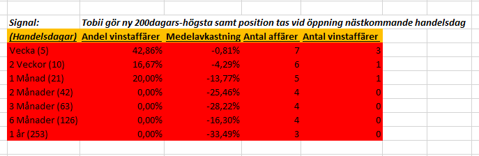 Vi kan se att aktien har rört sig inom ett konsolideringsintervall sedan mitten av 2017 men nu brutit sig ur intervallet. Frågan är ifall det är ett falsk utbrott precis som tidigare eller ifall vi har en skiftning i trenden. Det som talar för att det inte är ett falsk utbrott är att vi konsoliderat ovanför konsolideringsintervallet och ser ut att samla styrka för fortsatt uppgång mot tidigare bottnar (som nu fungerar som motstånd). Statistiken säger dock att vi har med ett falsk utbrott att göra då vi inte har en edge när aktien gör en ny 200-dagars högsta, vilket vi kan se nedan.