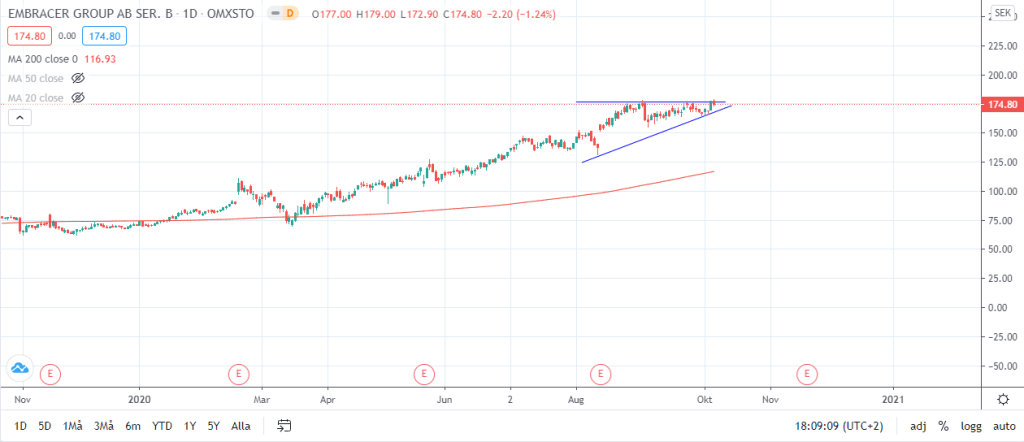 Vi har en avkastning på ca 7 % [(174,80-162,9)/162,9]*100 då aktien kostade 162,90 kr vid förra analysen och igår stängde på 174,80 kr. Vi kan även se ovan att Embracer har börjat uppvisa en tydlig triangelformation (med mindre och mindre volatilitet) vilket bör leda till en större rörelse inom en snar framtid.