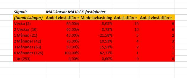 K-fastigheter är en relativt ny aktör på börsen, vilket gör att det inte finns så mycket data att göra analys på, dock kan vi se vad som händer när MA5 korsar MA10 då MA5 i nuläget handlas under MA10 i bolaget.