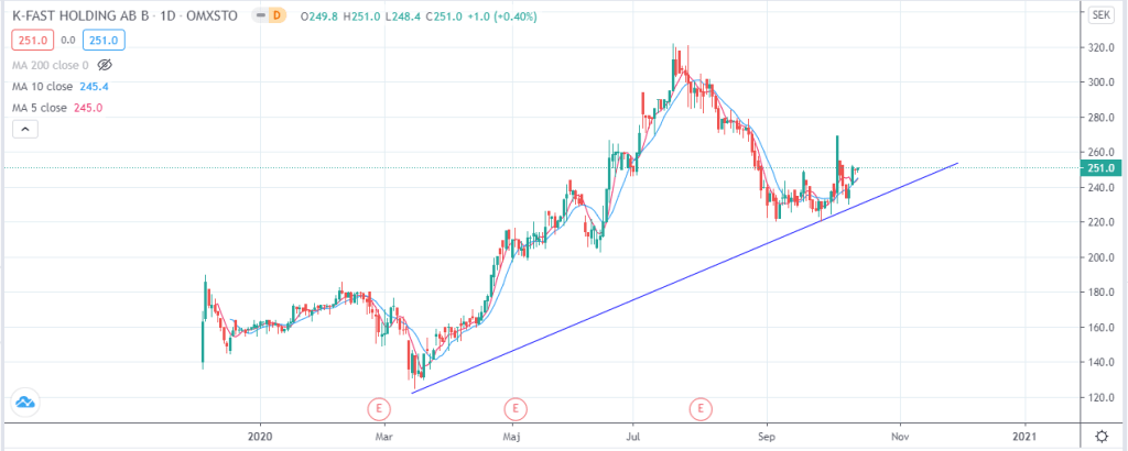 Vi kan se att aktien befinner sig i en uppåtgående trend, bolaget har gått lite svagare sedan i augusti då den befann sig på toppnivåer så frågan är ifall vi haft en botten omkring 220 kr då vi har mycket stöd där från en topp i juni bland annat.
