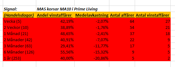 Igår korsade MA5 MA10 i aktien och frågan är ifall vi har en edge i bolaget, för även hur mycket man än ogillar bolaget så skall man skilja på bolag samt edge. Ifall det visar sig att man har en edge så skall man inte backa undan enbart för att man inte gillar bolaget, dock så brukar usla bolag straffas med att inte uppvisa någon edge. Ifall vi hade kopplat in våra känslor i besluten så hade backtestingen (ett kvantitativt handelssätt) varit bortkastat tid, då backtesting går ut på att just tygla sina känslor (inte sälja ifall ens bolag går ned då man i förväg har bestämt med hjälp av statistik hur länge man skall behålla bolagen samt inte rusa in i överhypade bolag).