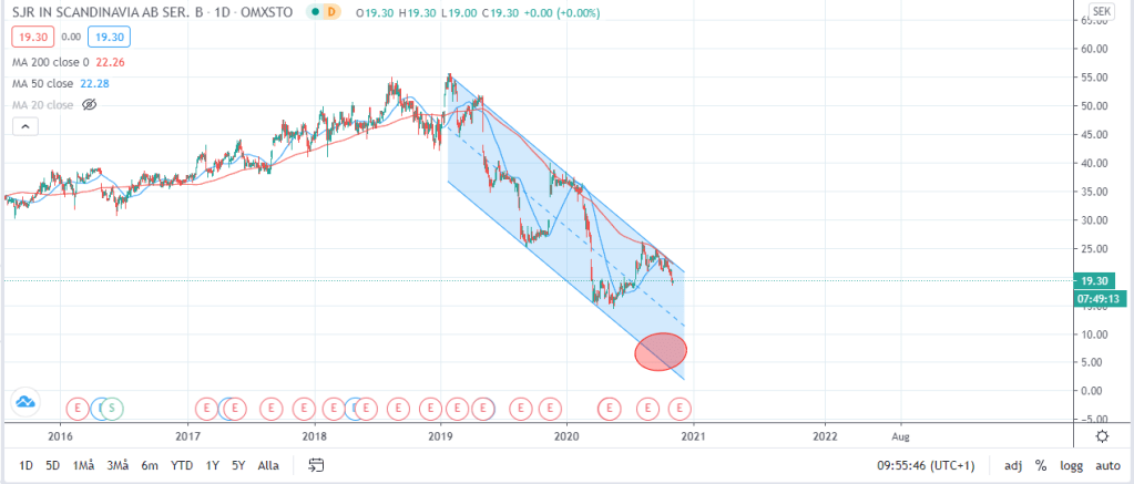MA50 håller på att korsa (marknaden har inte stängt ännu men just nu så har MA50 korsat MA200) MA200 i SJR in Scandinavia och frågan är ifall vi har en edge eller ej. Bolaget är inriktat på bemanning inom banksektorn och frågan är hur hett det är just nu då min känsla är att företag rekryterar mindre just nu på grund av Corona. Bolaget har även haft en knackig historia på börsen vilket vi kan se nedan.