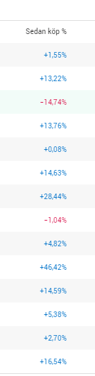 Glöm inte bort att jag visar hela min portfölj i slutet av varje månad för mina prenumeranter (så på måndag nästa vecka) och i nuläget ser avkastningen ut som följande för mina bolag (avslöjar dock inte vilka bolag utan då måste ni prenumerera för att få se det nästa vecka):