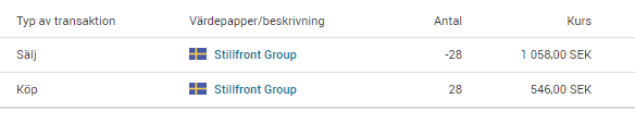 Här ser vi att jag köpte Stillfront på kursen 546 kr och sålde på 1058 kr, alltså en avkastning på cirka 94 %. Anledningen till varför det diffar lite mellan 92 % (i tabellen ovan) samt min avkastning är för att jag inte sålde på exakt samma stängningspris som backtestingen baseras på.