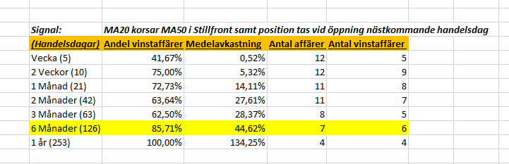 I våras fick jag fram siffrorna ovan som kollade hur stor sannolikheten är för uppgång i Stillfront när MA20 korsar MA50. Siffrorna i tabellen säger följande: