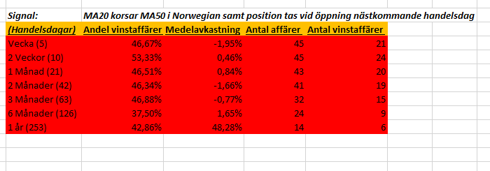 Idag har jag i stället gjort en analys på huruvida vi har en stor sannolikhet för uppgång i Norwegian när MA5 korsar MA10.