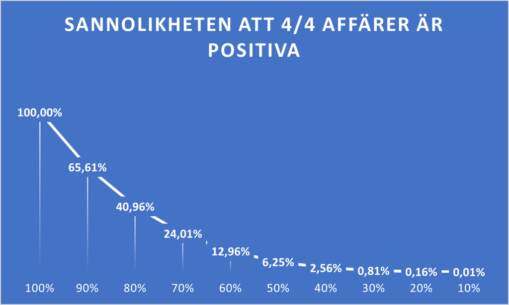 Anledningen till varför inte ”1 år” väljs som har hela 100 % i edge är att vi enbart kan basera det på tre affärer och då kan slumpen varit en avgörande faktor till att vi haft tre vinstaffärer av totalt tre affärer. Det är exempelvis inte rimligt att vi alltid kommer ha 100 % andel vinstaffärer när det kommer till ”1 år”. Vi kan göra ett räkneexempel för att se hur edgen (andel vinstaffärer) påverkar sannolikheten för att även nästa affär på 1 års sikt kommer vara positiv (alltså 4 av 4 affärer positiva).