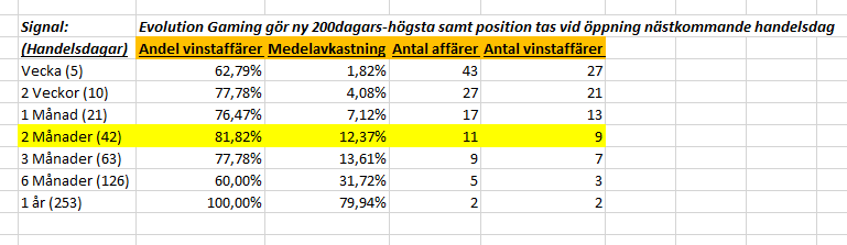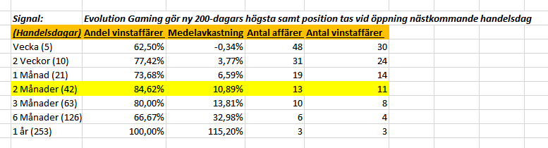 Att ifall vi köper Evolution Gaming nästkommande handelsdag efter den gjort en ny 200-dagars högsta samt behåller aktien i 42 handelsdagar så har vi cirka 85 % vinstaffärer samt en medelavkastning på 11 %.