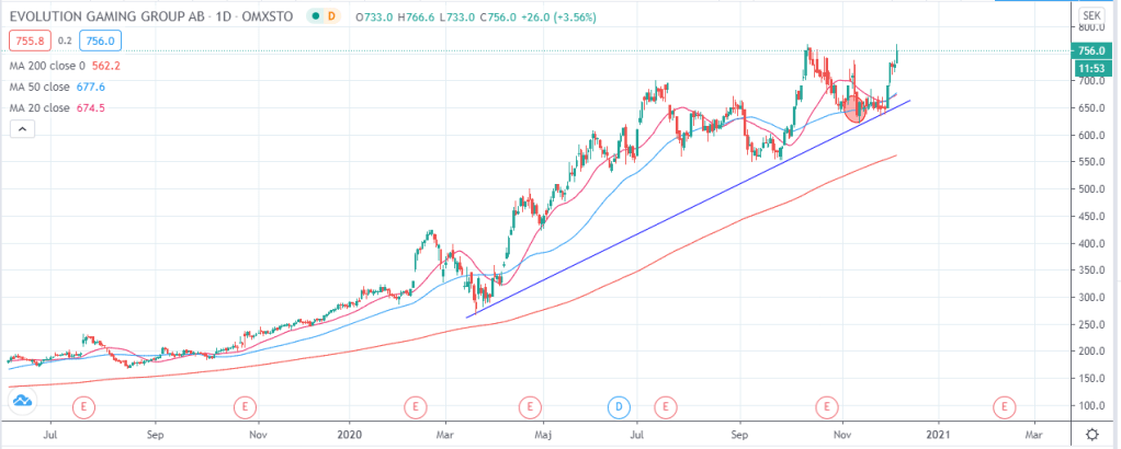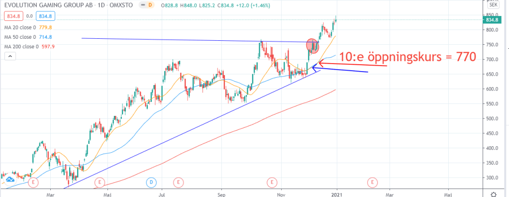 Varje vecka så gör jag backtesting på tre aktier som mina prenumeranter får bestämma och vecka 49 så föll valet på Evolution Gaming. Det mina prenumeranter kunde läsa då var att vi hade en edge i aktien (sannolikheten stor för uppgång). Aktien såg ut som nedan: