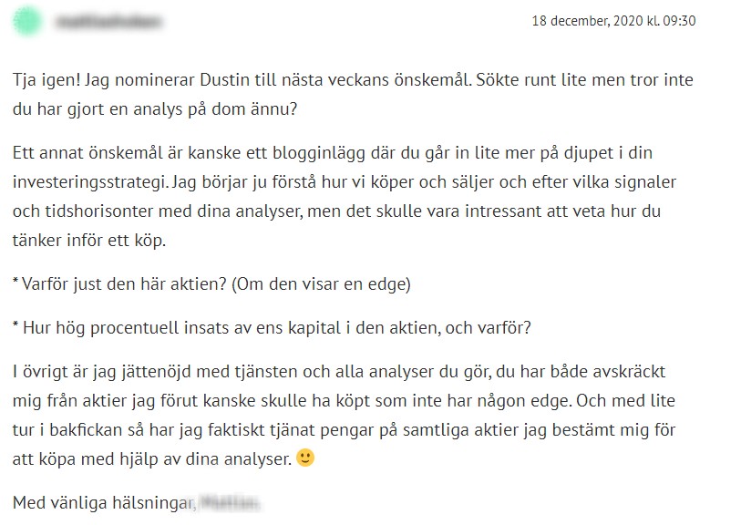 - Full transparens genom att jag i slutet av varje månad delar med mig av min portfölj (visar även summan jag äger).