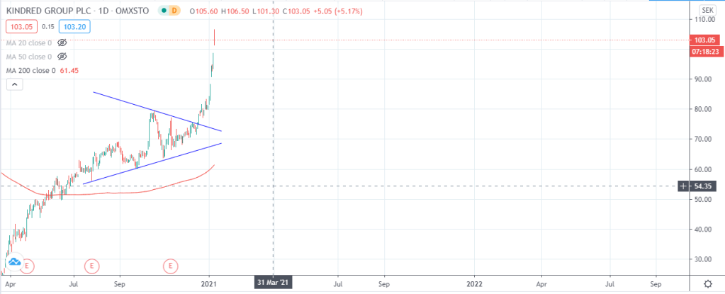 Varje vecka tar jag emot önskemål från mina prenumeranter på kommande backtestingar. Den 19:e november gjorde jag backtesting på just Kindred efter önskemål och då visade min modell att vi hade en edge vilket har utspelat sig bra. Då gjorde jag backtestingen på signalen MA5 korsar MA10 som ni kan se nedan och idag kollar jag på signalen 200-dagars högsta istället.