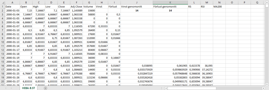 Jag har jobbat på en ny backtesting-strategi i Excel där jag använder mig av RSI samt MA200 för att hitta aktier som är översålda men som befinner sig en positiv grundtrend.