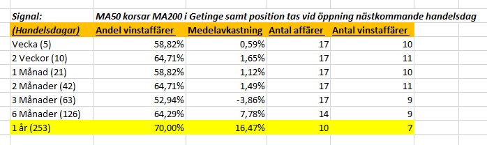 Vi kan se ovan att Getinge befinner sig i en stigande triangelformation som statistiskt brukar leda till uppbrott på ovansidan (62 % av gångerna). Idag så korsade MA50 MA200 vilket brukar kallas för ett gyllene kors. Det min modell gör då är att den kollar vad som skett historiskt (avkastningsmässigt) när position tas nästkommande handelsdag när den här signalen visat sig. Positionen stängs efter olika tidsperioder för att hitta hur länge aktierna skall behållas (den tidsperiod som har en edge väljs). Alltså vet man i förväg hur länge en aktie skall behållas vilket gör att känslorna inte blandas in i säljbeslutet.