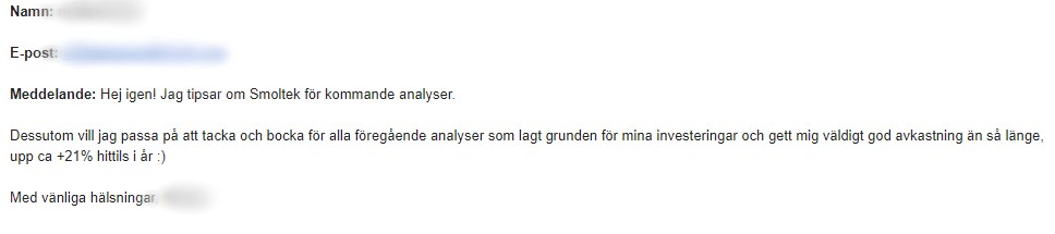 Då stod aktien i 2,450 kr för att i nuvarande stund stå i 1,720. Alltså en avkastning på cirka -30 % [(1,720-2,450)/2,450]. Så analysen föll ut bra.