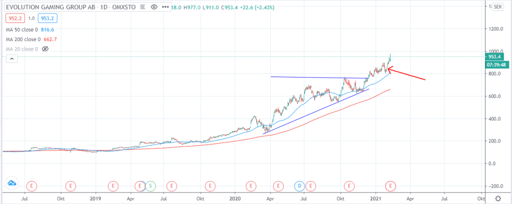 I det här fallet fick vi en kraftigare rörelse från 840 kr till 969 kr som var dagens stängningskurs (alltså en avkastning på cirka 15 %) så analysen har än så länge utvecklats väl. Idag har jag som sagt kollat på huruvida vi har en edge i Evolution Gaming, överköpthet, varför vi skall rida på trenden i en aktie om vi har data som visar att sannolikheten är stor för fortsatt uppgång samt att det är viktigt att acceptera utfallet av sina affärer.