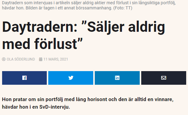 Jag tycker att det ovan ger en fel bild av hur man kan förvänta sig att sin portfölj skall fungera och risken är att man inbillar sig att man skall hitta en strategi som gör så att man alltid är en vinnare och aldrig säljer med förlust, dock är det omöjligt att ALLTID vara en vinnare och det gör så att man riskerar att hoppa mellan strategier vilket är förödande för portföljen. Det skulle dock kanske vara möjligt att alltid vara en vinnare ifall man har en väldigt lång tidshorisont då aktiemarknaden har en positiv drift uppåt överlag dock så förutsätter det att man har en tidshorisont som sträcker sig väldigt lång bort (troligtvis längre bort i tiden än vad man kommer leva).