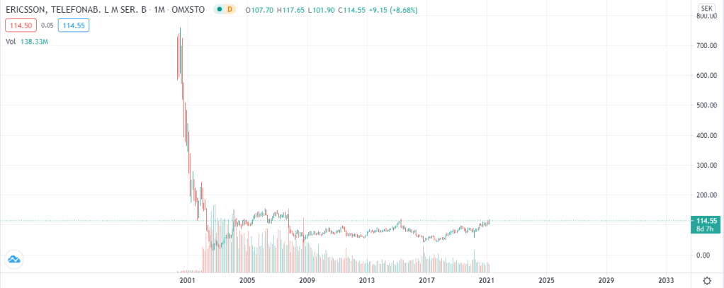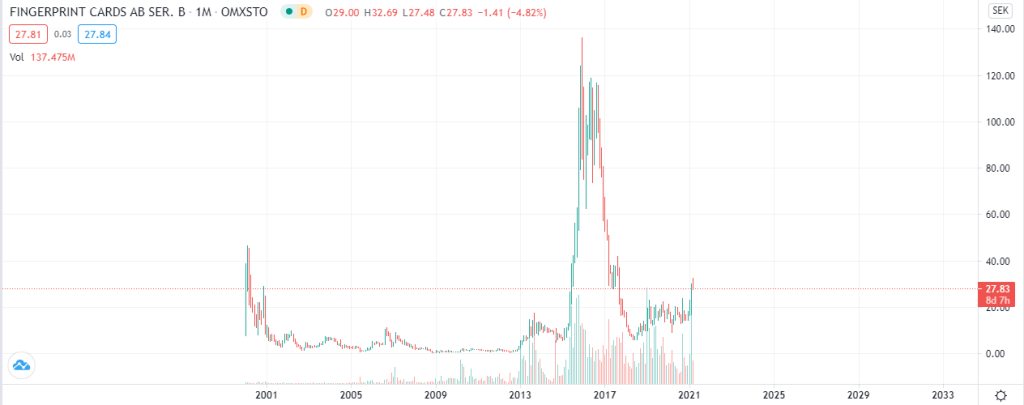 Tänk exempelvis om en investerare hade köpt Fingerprint samt Ericsson när dessa befann sig vid toppnivåerna nedan.