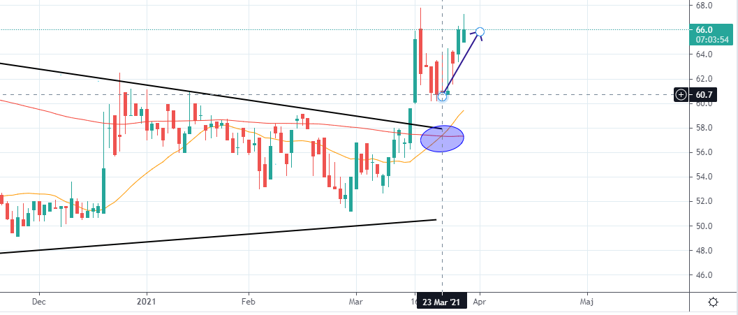 Vi kan se att signalen uppvisade sig den 23:e mars och då stod aktien i 60,7 kr vid öppning nästkommande handelsdag så vi har fått en avkastning på cirka 9 % under fyra handelsdagar (en uppgång som jag visar med den blå pilen) vilket inte är fy skam, så den analysen har fallit ut bra än så länge.