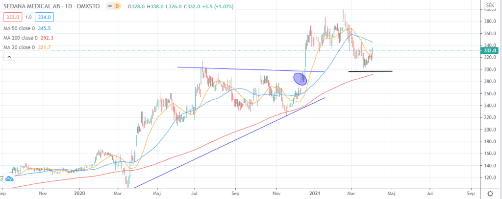 Jag skrev bland annat följande vid den analysen ”Den här aktien ser onekligen intressant ut. Vi har både en stigande triangel (som statistiskt allt som oftast betyder fortsatt uppgång i aktier) samt så börjar MA20 närma sig MA50”. Vi kan se nedan hur aktien ser ut i dagsläget.