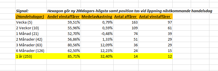 Idag har jag gjort backtesting på en ny signal och då på vad som skett när Hexagon gör en ny 200-dagars högsta. Jag gjorde backtesting på den signalen den 15:e september förra året som även den visade att vi hade en edge (ett års sikt). Då såg aktien ut som följande: