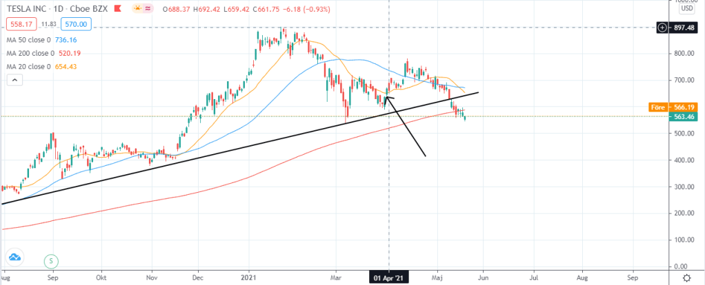 Kan ge ett exempel på när dessa sannolikheter verkligen kommer till nytta. Jag gjorde exempelvis backtesting på Tesla vecka 12 (den veckans önskemål) där jag kollade hur aktien brukar reagera när den stänger ovanför MA20. Mina prenumeranter fick då tillgång till en tabell som visade på att det inte fanns någon edge ifall man tar en position i Tesla när aktien stänger ovanför MA20, och vi kan se nedan att statistiken ännu en gång hade ”rätt”.