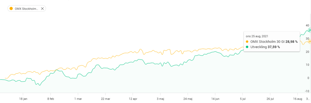Som vi kan se så har min modell avkastat ungefär 10%-enheter mer än index (OMX30 inklusive utdelningar) så jag är nöjd med hur modellen utvecklats. Glöm inte att börja prenumerera ifall ni nästa vecka (min månatliga uppföljning) vill se min portfölj, hur min modell har utvecklats sedan start och hur stor andel vinstaffärer jag haft sedan start. Kan avslöja att det är över 70% vilket min modell säger att jag skall ha som minst.